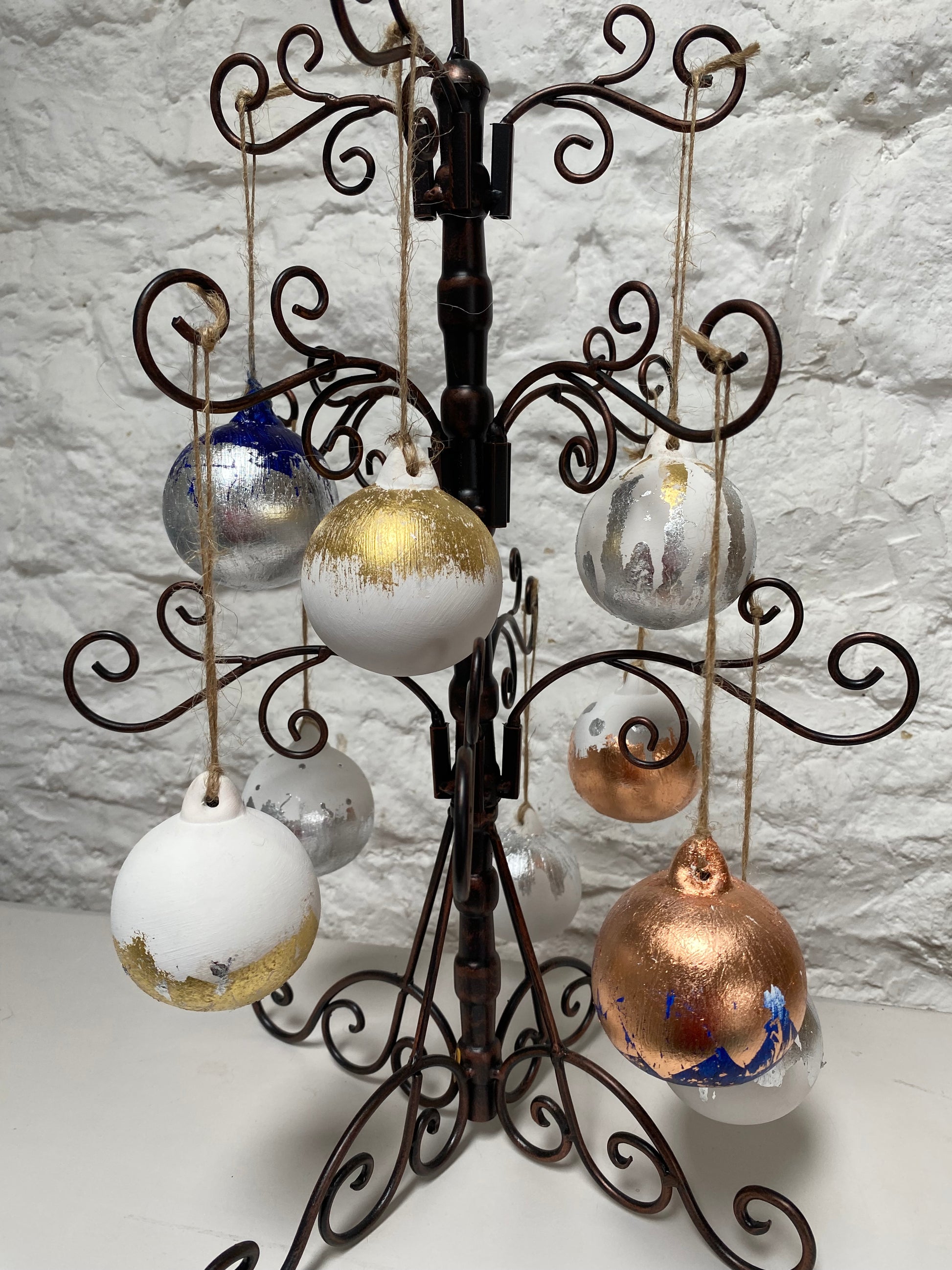 These beautiful white ceramic baubles have been hand decorated by us with gold, silver or copper leaf.